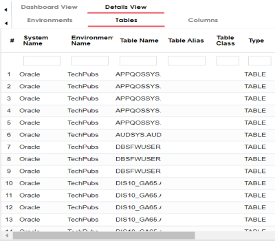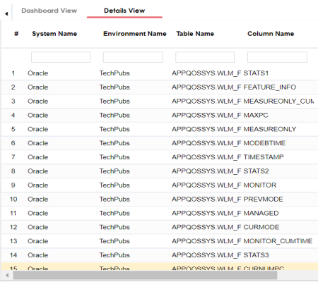 To view detailed information about sensitive columns in a system, click a bar. The Details View tab opens. It displays system name, environment name, table name, column name, and SDI flag.