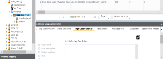 You can create mapping specifications using drag and drop method, even when source column names are different from target column names. After mapping source to target, you can set the target update strategy and enter a description about the strategy.