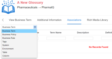 - In the asset type (business policies, business terms, columns, environments, and tables) list, select an asset type to associate with the business term.