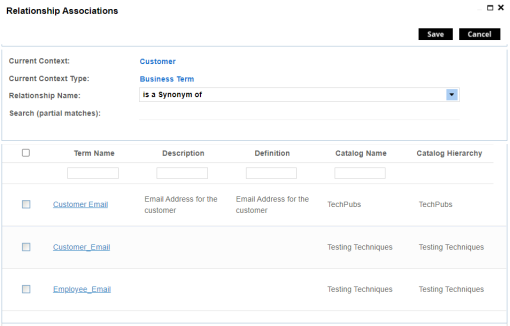 On the relationship association page, select Business Term from the asset type list to associate with the business term Email using Customer as a qualifier. - In the asset type (business policies, business terms, columns, environments, and tables) list, select Business Term to associate with the business term Email using Customer as a qualifier.