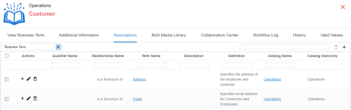 The Associations tab opens in edit mode. - In the asset type (business policies, business terms, columns, environments, and tables) list, select Business Term to associate with the business term, Customer.