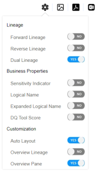 )- Use this option to view lineage types, business properties and customizations options. For more information on lineage options, refer to the running lineage analysis on Table topic.