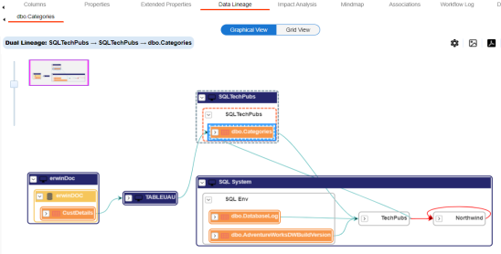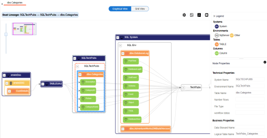 Graphical View: The graphical view displays the lineage of the table in a graphical format. Selecting a column on the graphical view displays its properties in the Node Properties pane and Legends.
