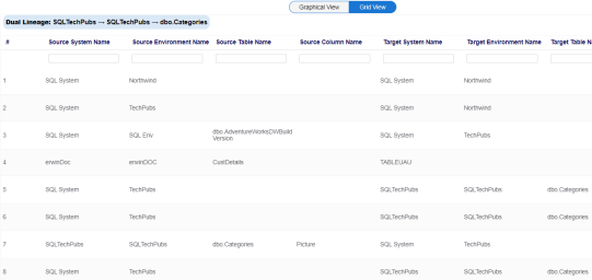 Grid View: The grid view displays the lineage of the table in a tabular format. You can view the source and target system associated with the selected system.