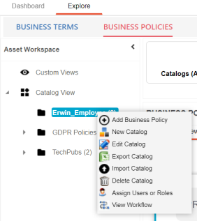The Workspace switches to the business policies view. - In the Asset Workspace pane, under the Business Policies node, right-click a catalog node.