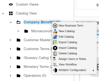The Workspace switches to the business terms view. - In the Asset Workspace pane, under the Business Terms node, right-click a catalog node.