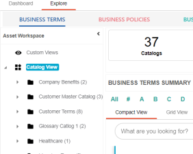 By default, Business Terms appear, and Asset Workspace pane displays catalogs.