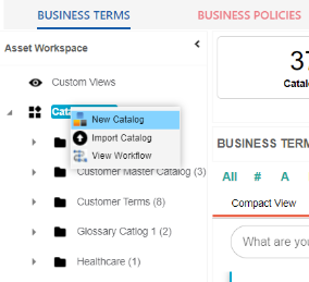 Catalogs are the containers for all the asset types that are created in the Glossary Workspace. You can group business assets based on your organization's projects, departments, or functions. Therefore, before creating business assets, you need to create a catalog. You can also create sub-catalogs to group business assets further.