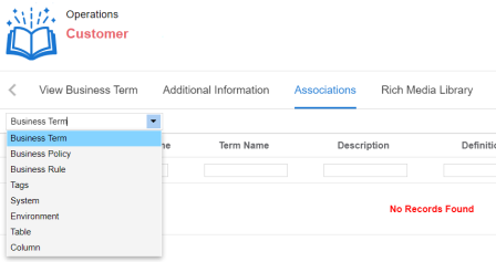 The Associations tab opens in edit mode. - In the asset type (business policies, business terms, columns, environments, and tables) list, select Business Term to associate with the business term, Customer.