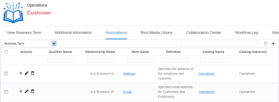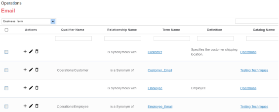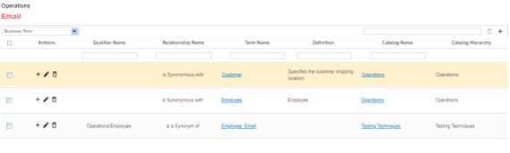- Employee information (employee’s email and address) is associated with the business term, Employee, using it as a qualifier.