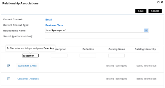 On the relationship association page, select Business Term from the asset type list to associate with the business term Email using Customer as a qualifier. - In the asset type (business policies, business terms, columns, environments, and tables) list, select Business Term to associate with the business term Email using Customer as a qualifier.