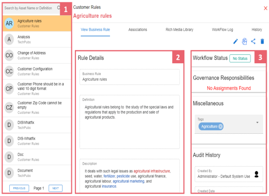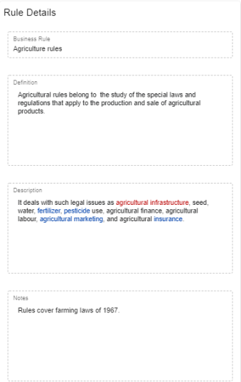- For example, in the following image, a tag, "Irrigation", is created and assigned to a business rule.