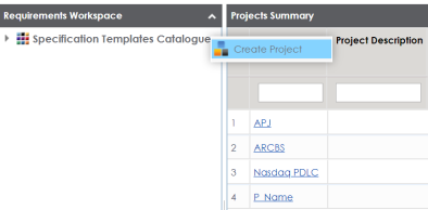 Right-click or select a project in the Requirements Workspace pane to manage it. Managing projects involves: