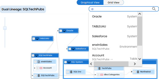 As you type in the search box, a list of related tables that are available on the lineage appears.