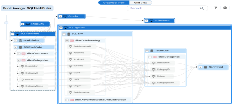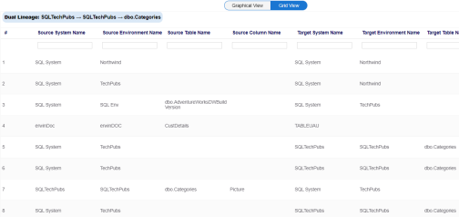 Grid View: The grid view displays the lineage of the table in a tabular format. You can view the source and target system, environment, table and column associated with the selected table.
