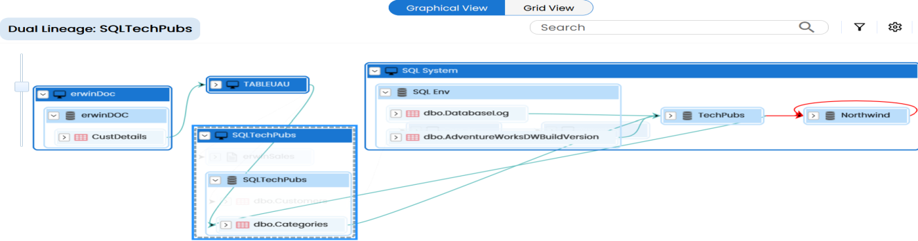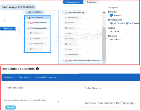Graphical View: The graphical view displays the lineage of the table in a graphical format. Selecting a table on the graphical view displays its Legends. Hovering over a table displays an