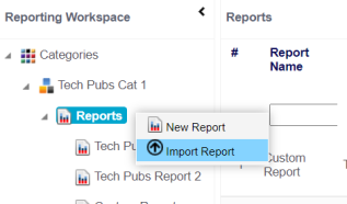 - In the Reporting Workspace pane, expand a category node, and right-click the Reports node.