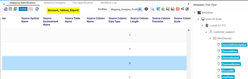 The append mode is enabled. You can now drop multiple columns from the Metadata Tree View pane in one row of the Mapping Specification grid.