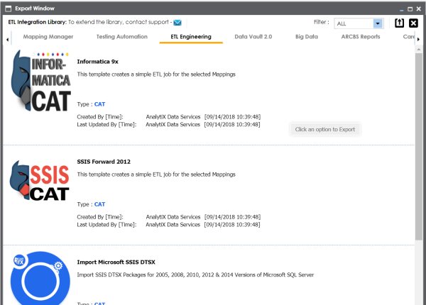 Once the mappings are considered 'approved for coding', you can export the mappings as coding requirements to automatically generate ETL/ELT jobs. The ETL jobs can be generated for tools, such as Informatica PowerCenter, IBM DataStage, Microsoft SQL Server SSIS, and Talend.