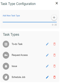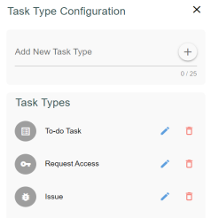 You can configure task types to categorize tasks. By default, three task types, To-Do Task, Request Access, and Issue, are available. You cannot edit or delete these task types.