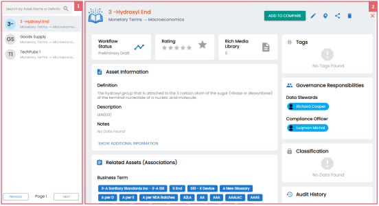 - On the Business Term List, select other assets that you want to compare, and click Add to Compare.