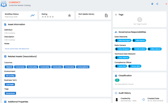For each business asset type on your ecosystem, the <Business Asset> section displays the total number of assets and associations on asset type-specific cards.