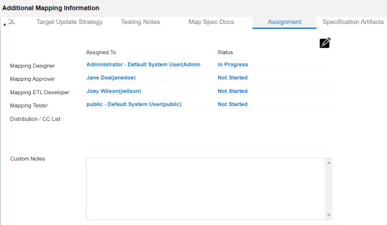 Specifies custom notes about the mapping assignment. For example: John Denver is the Mapping ETL Developer of the mapping specification. |