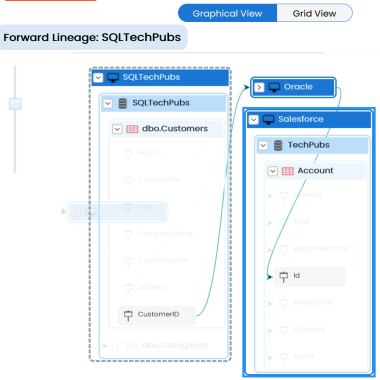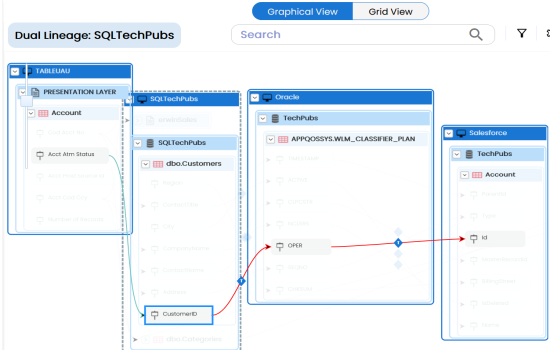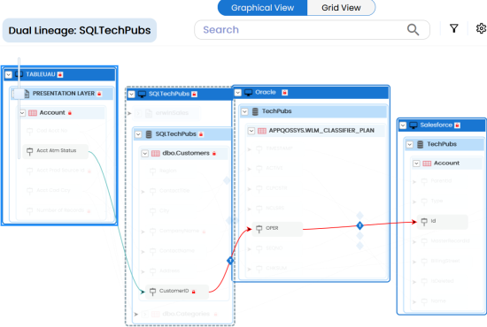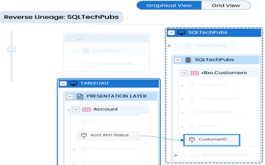 .- The column's reverse lineage is generated based on the options you selected. Similarly, you can generate forward, and dual lineage for columns. By default, the lineage appears in Graphical View.