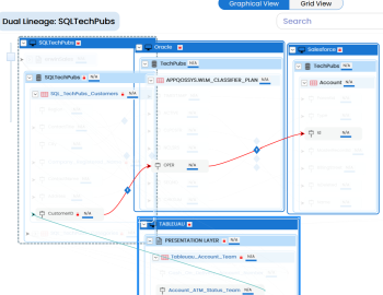 You can run forward and reverse lineage analysis to trace metadata at the column level. Forward lineage analysis generates a lineage with the column as source. And, reverse lineage analysis generates a lineage with the column as target. The Dual-Combined View lineage analysis generates a lineage, which includes both forward and reverse lineage.
