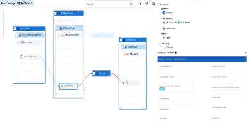 Graphical View: The graphical view displays the lineage of the column in a graphical format. Selecting a column on the graphical view displays its Legends. Hovering over a column displays an