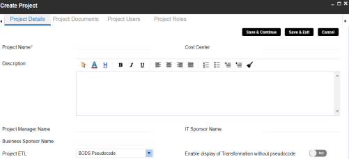 Projects store and group maps in a hierarchy, Projects > Mappings. You can create an ETL tool-specific project and specify its details, such as project description, project manager, business sponsor, cost center, and IT sponsor.