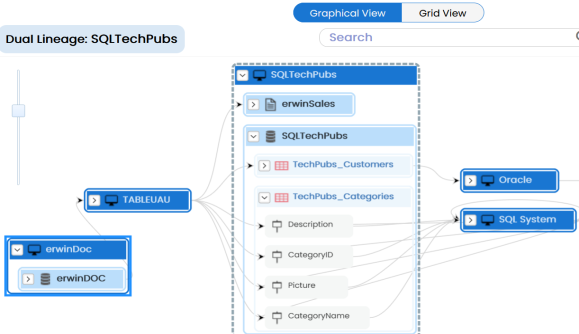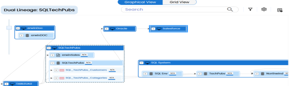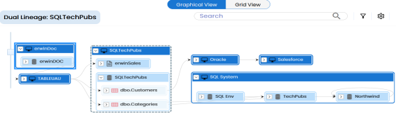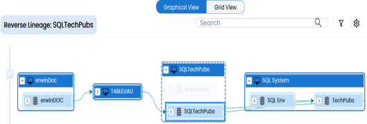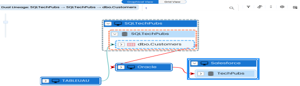 .- The environment's reverse lineage is generated based on the options you selected. Similarly, you can generate forward, and dual lineage for an environment. By default, the lineage appears in Graphical View.