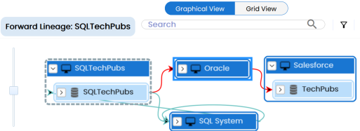 On the lineage, expand a system node, and select a table to view its lineage path. The environment is highlighted in blue color, its forward lineage path appears in red, and its reverse lineage path appears in blue. Systems and environments that are not part of a lineage path disappear.