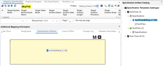 . - In the right pane, expand the Specification Artifact Catalog pane and drag and drop the required specification under the Specification Artifacts tab.