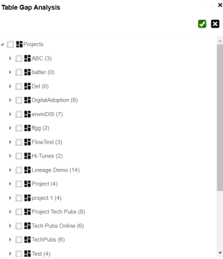 The Table Gap Analysis Report for the selected projects and mappings appears.