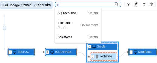 On the lineage, expand a system node, and select an environment to view its lineage path. The environment is highlighted in orange color, its forward lineage path appears in red, and its reverse lineage path appears in blue. Systems that are not part of a lineage path disappear.