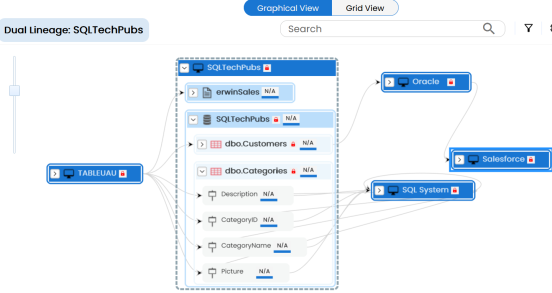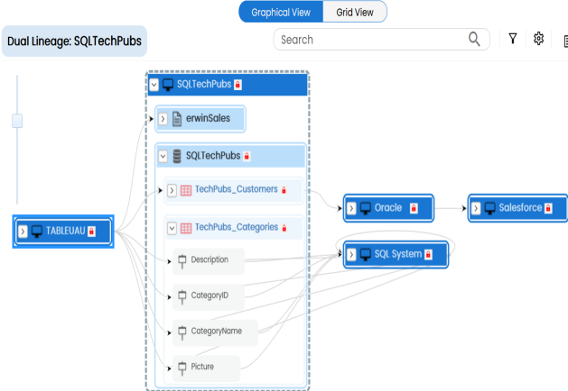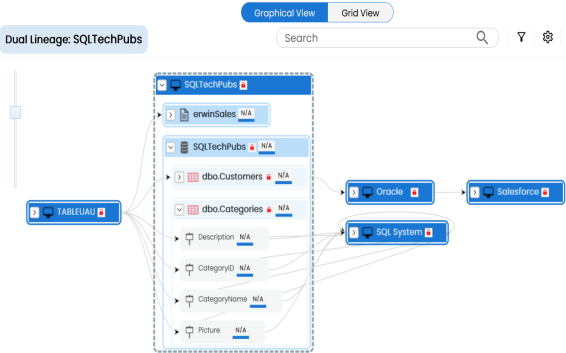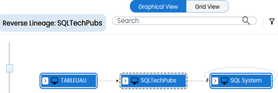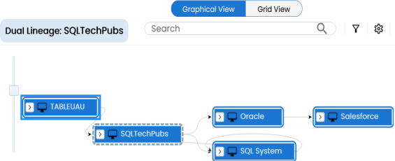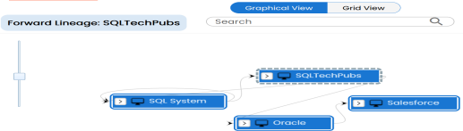 .- The system's forward lineage is generated based on the options you selected. Similarly, you can generate reverse, and dual lineage for a system. By default, the lineage appears in Graphical View.