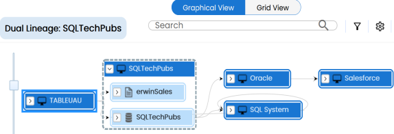 Use this option to view expanded logical names of the tables and columns in an environment in the lineage. You can expand a system node to view environments, tables, and columns. For more information, on configuring extended properties of a system, refer to the System topic