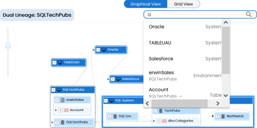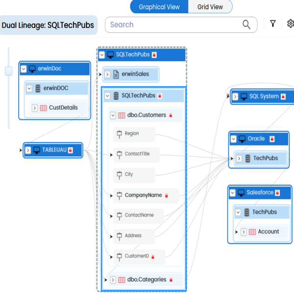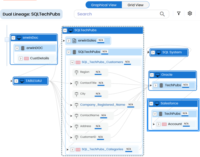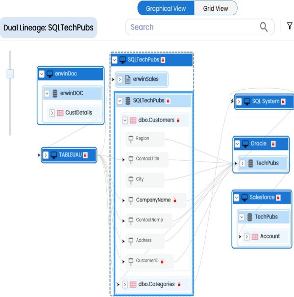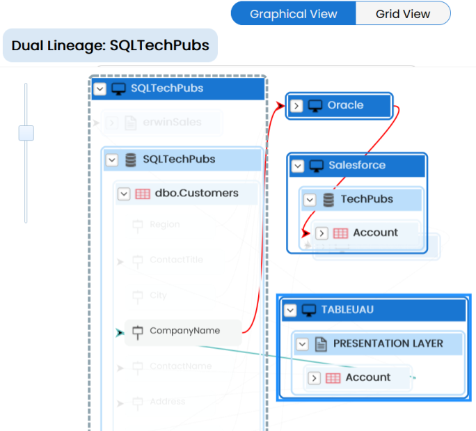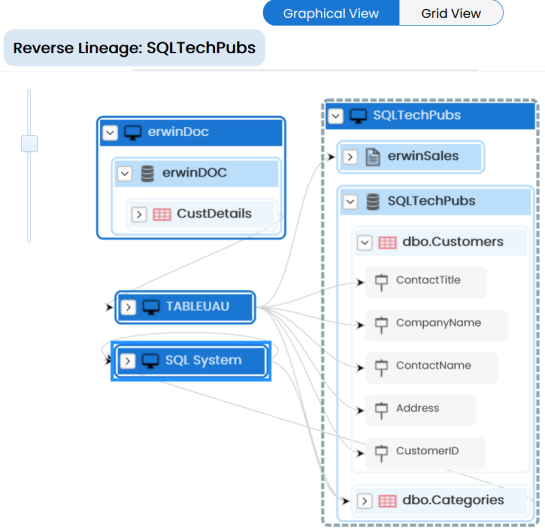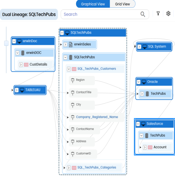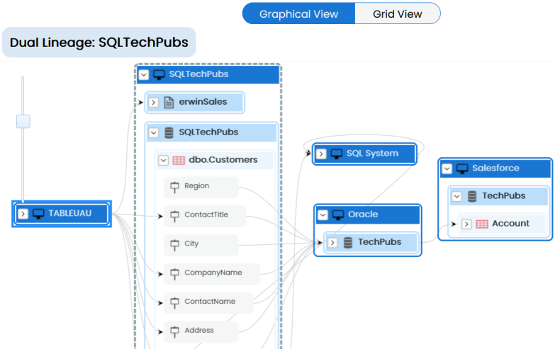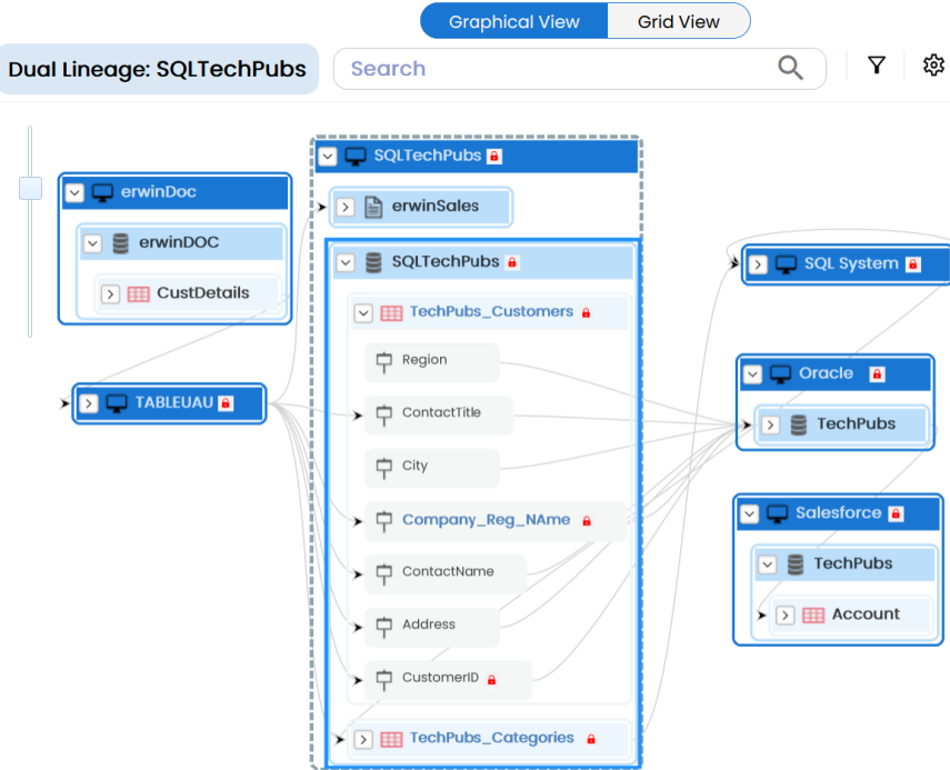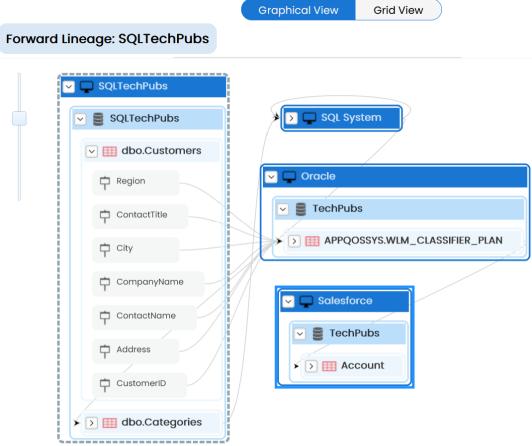 .- The table's dual lineage is generated based on the options you selected. Similarly, you can generate forward, and reverse lineage for tables. By default, the lineage appears in Graphical View.