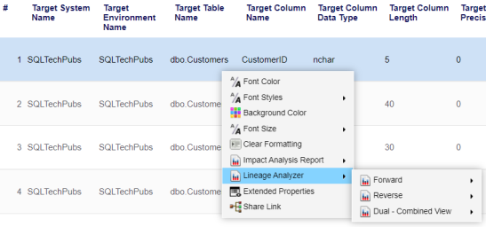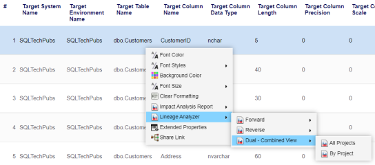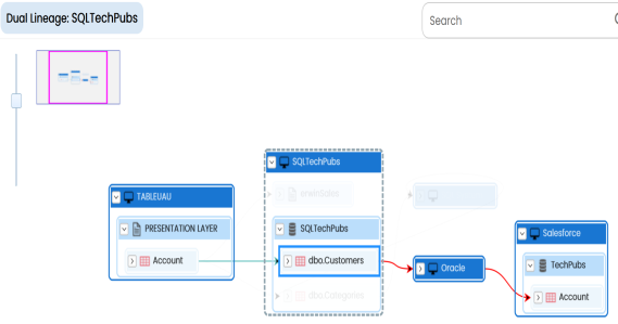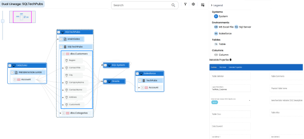 You can run forward and reverse lineage analysis to trace metadata at the table level. Forward lineage analysis generates lineage with the table as source. And, reverse lineage analysis generates lineage with the table as target. The Dual-Combined View lineage analysis generates a lineage, which includes both forward and reverse lineage.