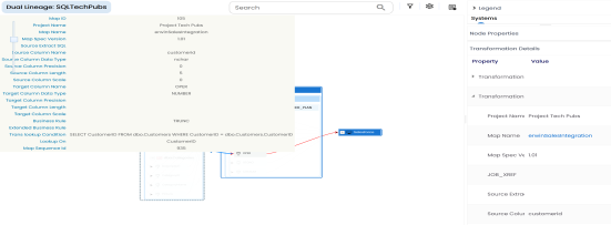 Graphical View: The graphical view displays the lineage of the table in a graphical format. Selecting a table on the graphical view displays its Legends. Hovering over a table displays an