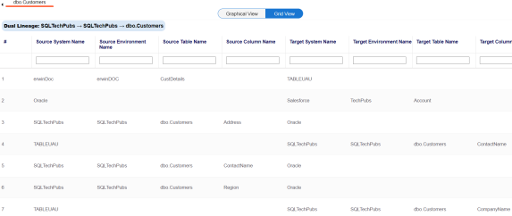 Grid View: The grid view displays the lineage of the table in a tabular format. You can view the source and target system, environment, table, and column associated with the selected table.
