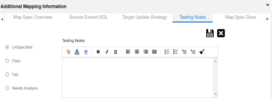 You can keep a record of testing notes related to a mapping specification and specify test results as: