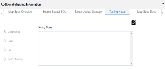 - In the Additional Mapping Information pane, click the Testing Notes tab.