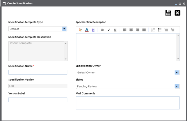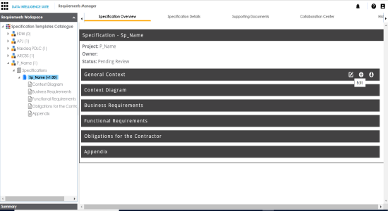 Specification Overview page depends on the Specification Template Type selected while creating the specification.