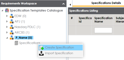 A new specification is created and stored in the specifications tree. The specifications tree is nested under the project node.