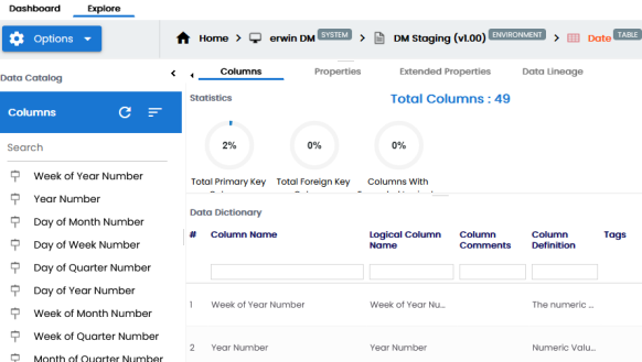 Apart from environment statistics, the Data Dictionary tab displays data quality analysis results, such as DQ Score from erwin Data Quality. You can drill down and view table or column level data quality analysis.