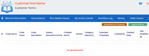 You can associate valid values (published codesets) to a business term. This enables you to maintain standard codes for business terms across the organization.
