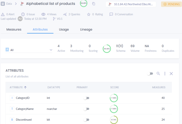 - Click the Attributes tab to view a list of all attributes and DQ scores.