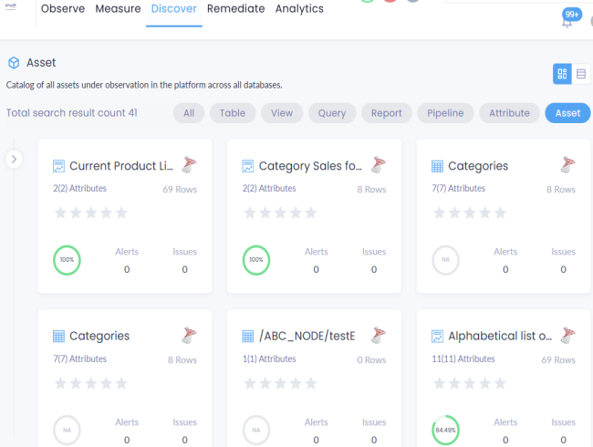 After profiling data, the Discover menu opens and displays the Asset page. This page shows the data quality analysis of all assets in a card format including asset name, attributes, rows, DQ scores, alerts, and issues.